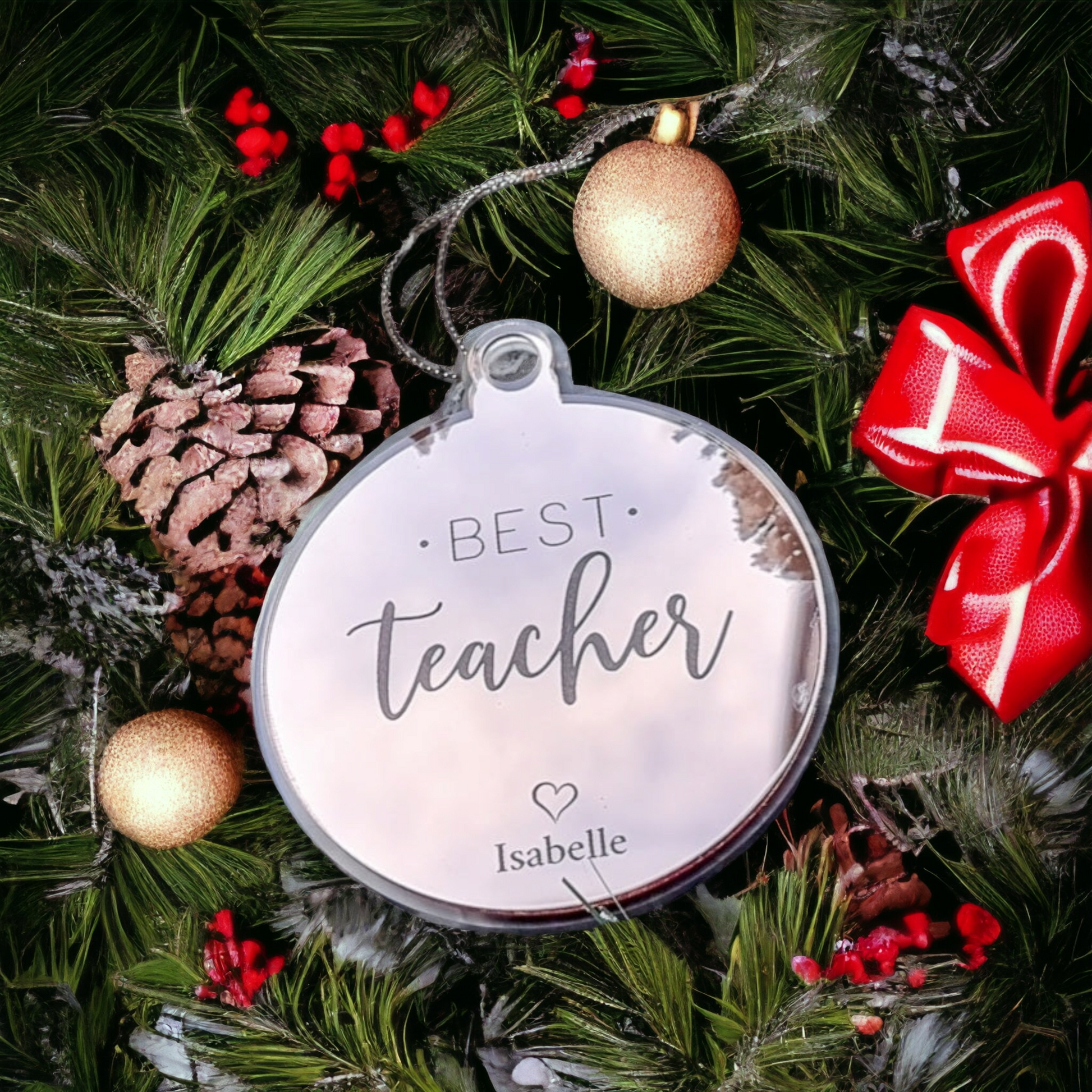 Made from 3mm plywood or mirrored acrylic engraved. They are then backed with a piece of frosted acrylic, making them durable and the perfect addition to a teacher’s Christmas tree!