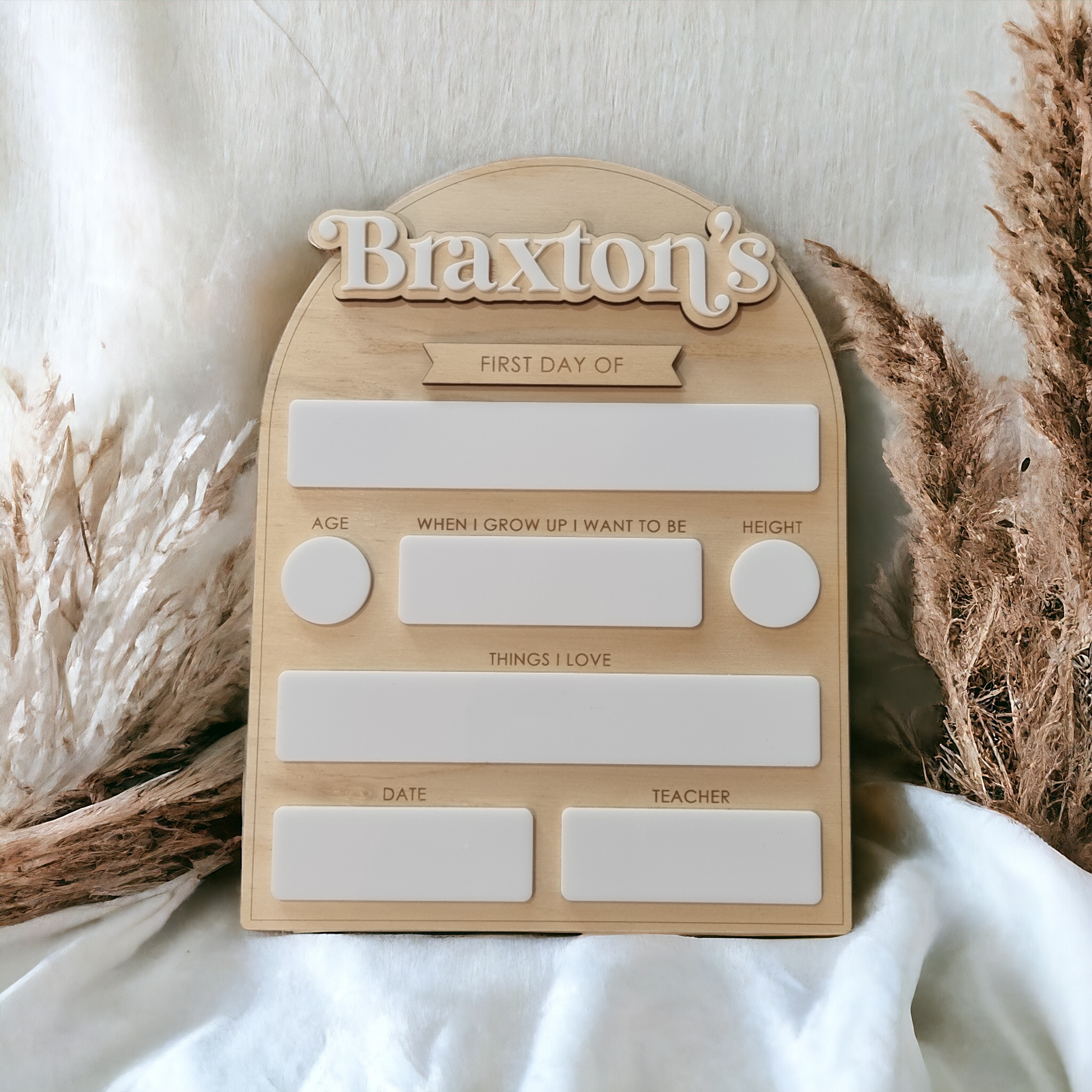 Introducing our Interchangeable First and Last Day of Board, a charming and customisable way to capture those precious moments. Crafted from hoop pine, this 29 x 22cm board can be personalised with your child's name. The board comes with interchangeable plaques that allow you to display your child's name and mark both the first and last day of the school year. Additionally, you have the option to purchase additional name plaques separately, granting you the flexibility to update and personalise the board for multiple children or for future years. This thoughtful and versatile board provides a unique way to celebrate and commemorate each school year.