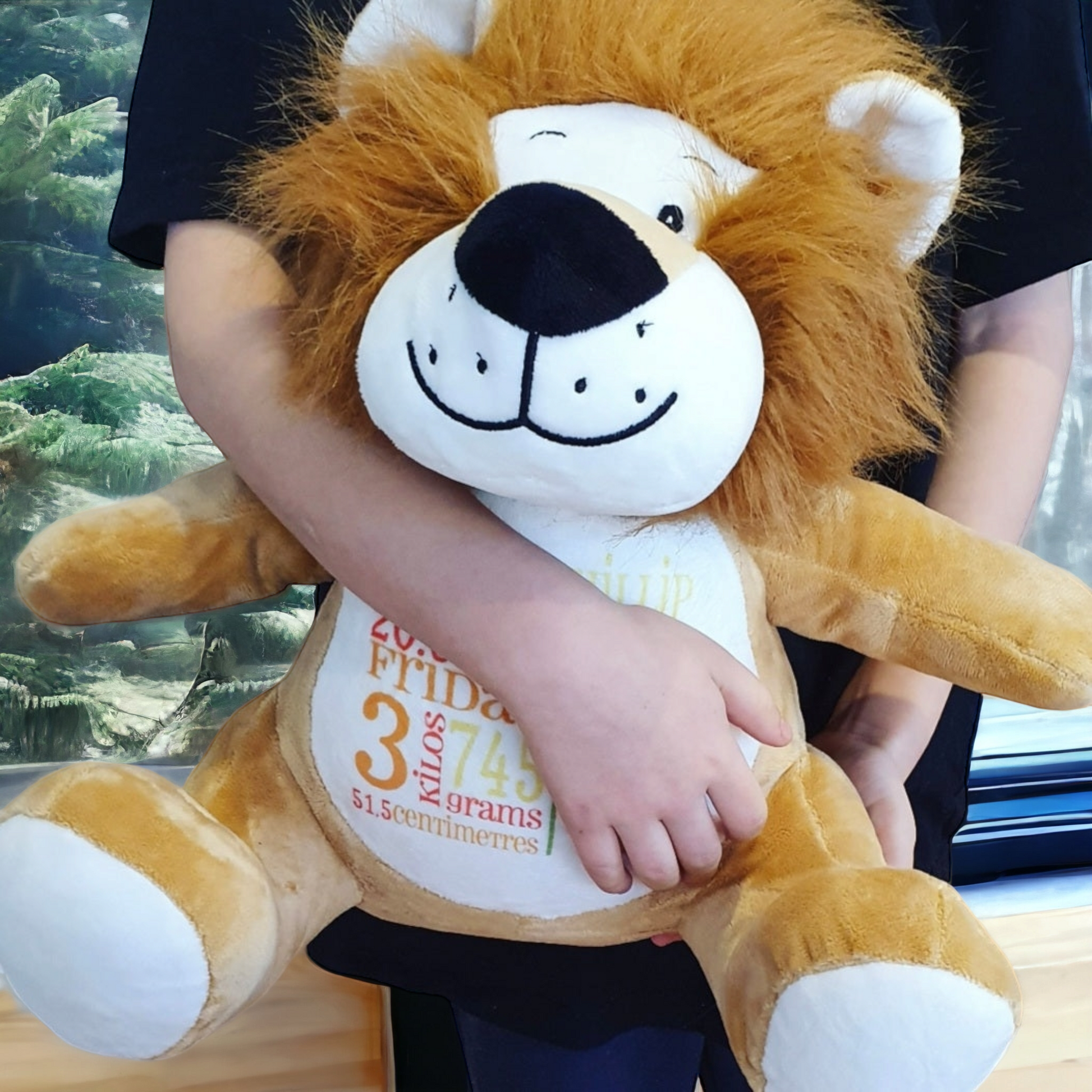 Our lion is printed to last with your personalised details that never washes or never wears! Cuddle up to our Oh So Soft lion and give him lots of love. He is extra large in size and deserves all the cuddles in the world.