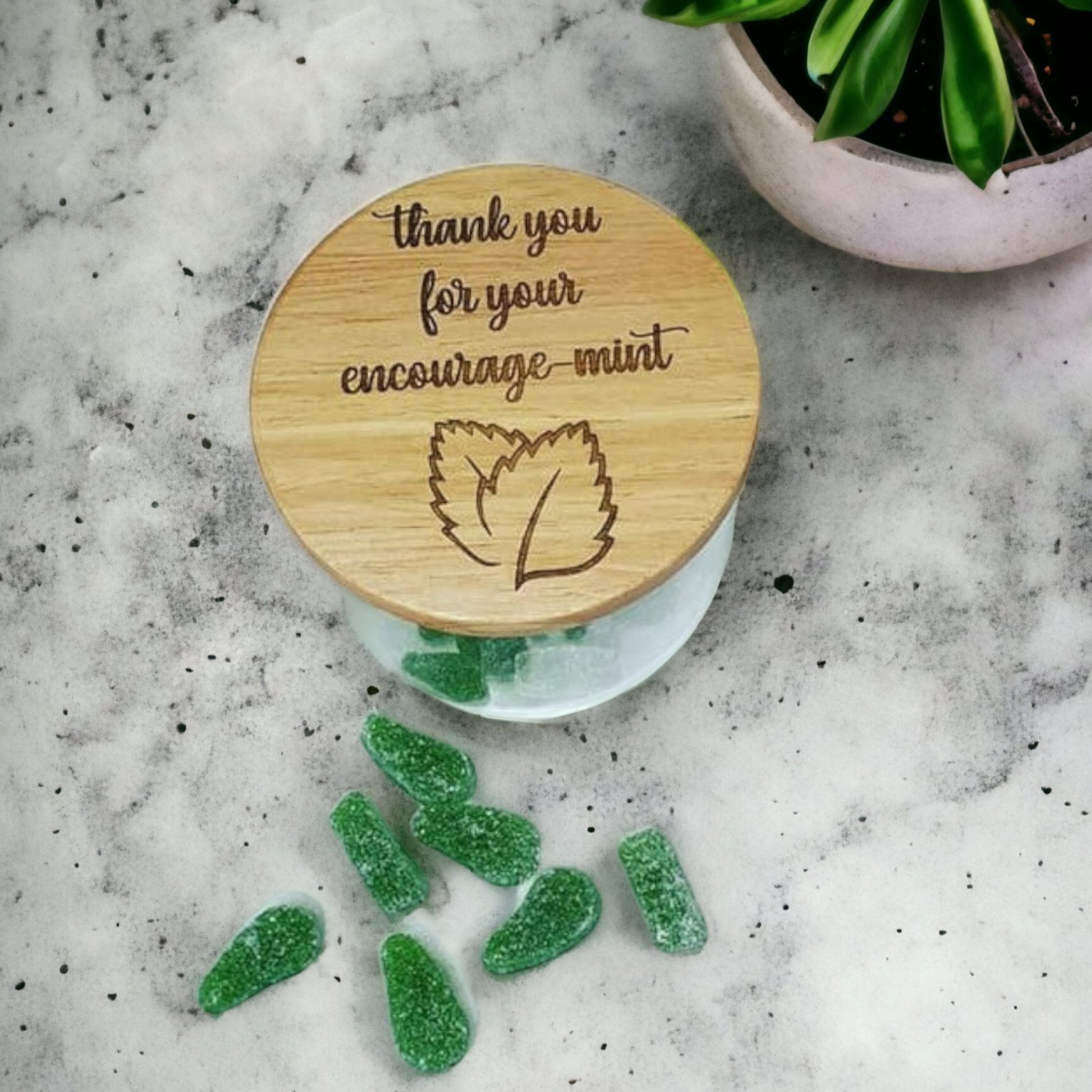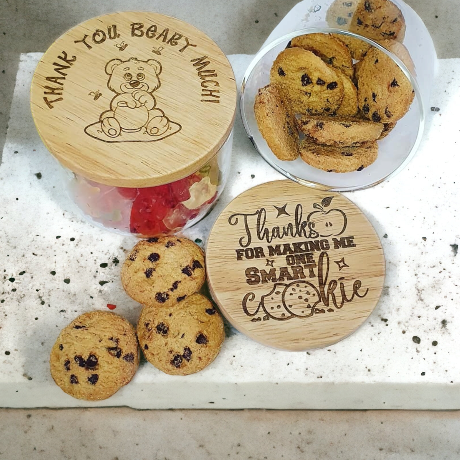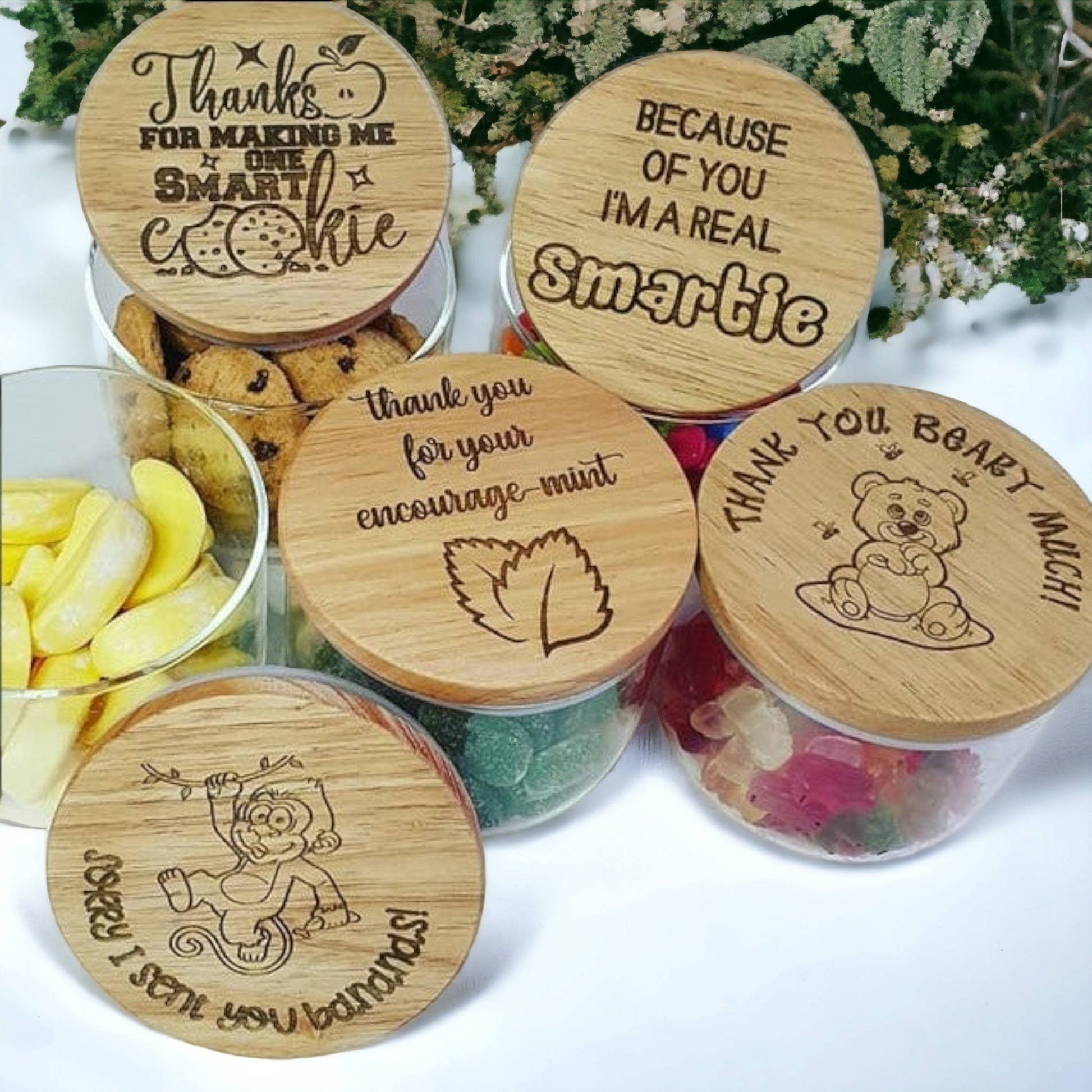 Introducing our Teacher's Gift Lolly Jars - a thoughtful and unique way to say thank you to your child's teacher. Our lolly jars are made of high-quality glass, with a rubber wood lid that provides an airtight seal to keep the contents fresh. You can choose from our selection of five designs and three sizes to find the perfect jar for your teacher.