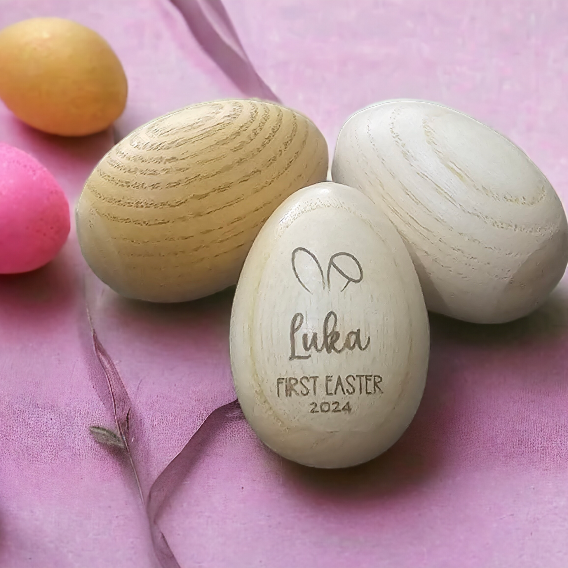 Make your little one's first Easter truly memorable with this exquisite natural wood Easter Egg Shaker, personalised just for them! Handcrafted with precision and care, this shaker is not only a delightful musical instrument but also a beautiful keepsake to cherish for years to come. The natural wood finish exudes elegance and warmth, while the intricate engraving adds a personalized touch that sets this shaker apart.