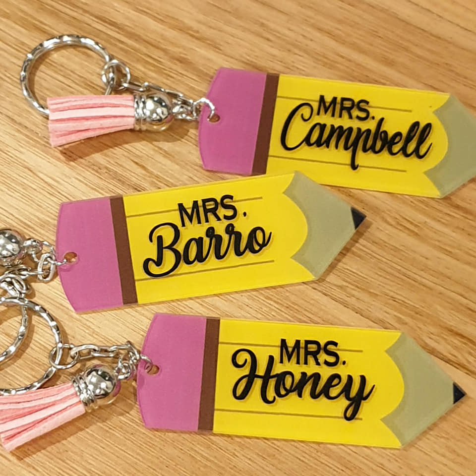 Looking for a creative and personalised gift for your teacher or loved one? Look no further than these customised pencil keyrings, the perfect 'end of year' thank you. Our keyrings are a great addition to your collection of everyday items, adding a touch of personality with your name of choice.
