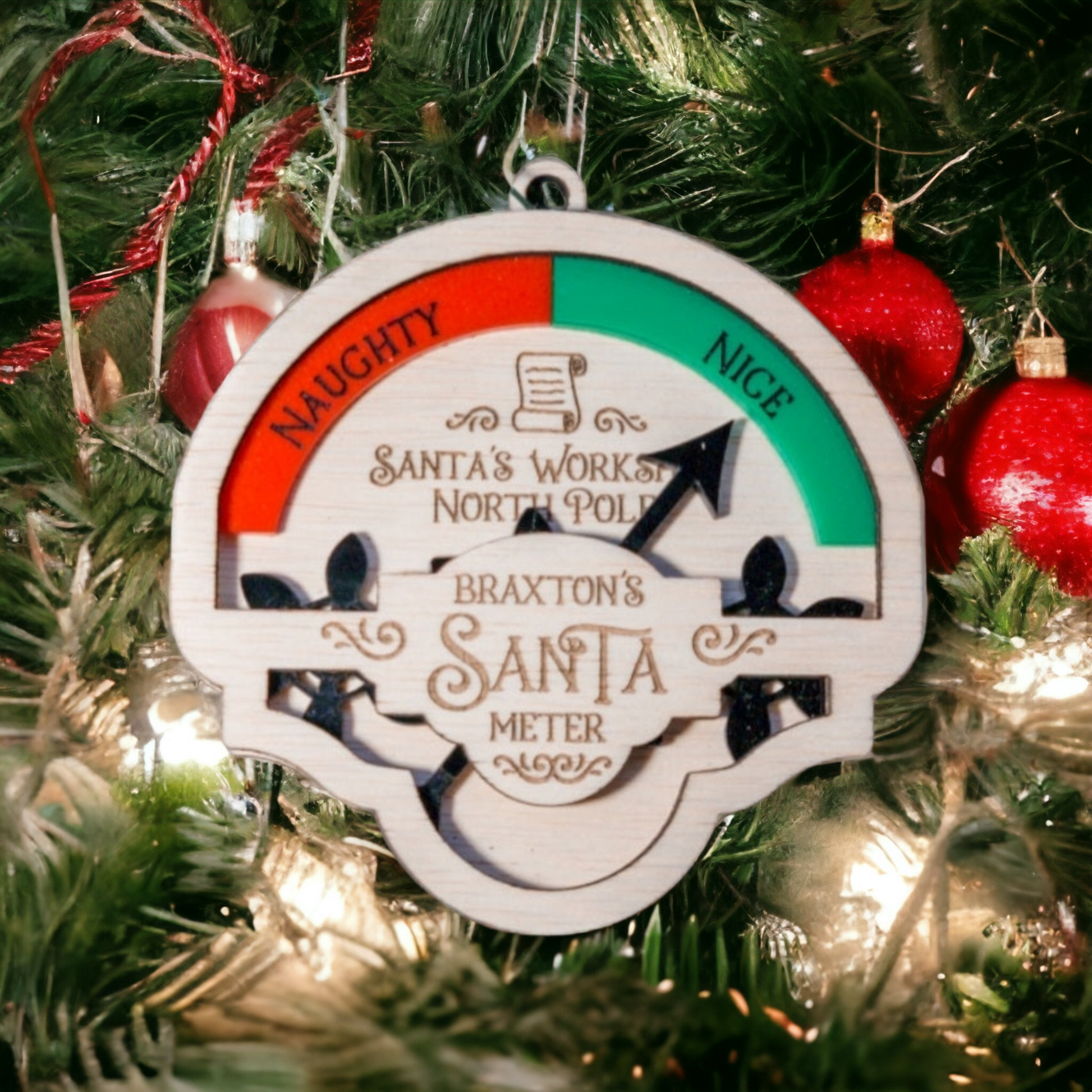 Introducing the Santa Meter Ornament, a whimsical and interactive addition to your holiday decor! Crafted with care, this charming ornament is made of high-quality plywood and acrylic, ensuring durability and a festive touch to your Christmas tree.